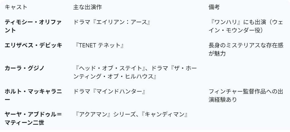 『TENET テネット』のエリザベス・デビッキ、『マインドハンター』のホルト・マッキャラニーなど、フィンチャー監督作品の世界観に合いそうな実力派俳優が多く名を連ねており、クリフ・ブースの新しい冒険を支える存在として、どのような役割を果たすのか注目ですね!