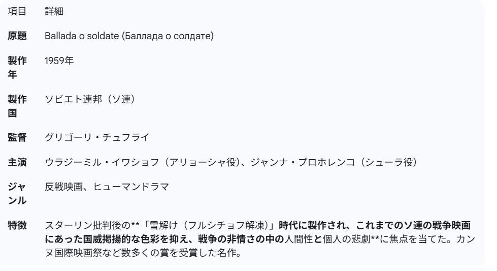 しかし、グリゴーリ・チュフライ監督の傑作『バラード・オブ・ソルジャー』は、その対極にあります。この映画が描くのは、英雄ではなく、一人の純粋な若者アリョーシャの、たった6日間の短い旅路。