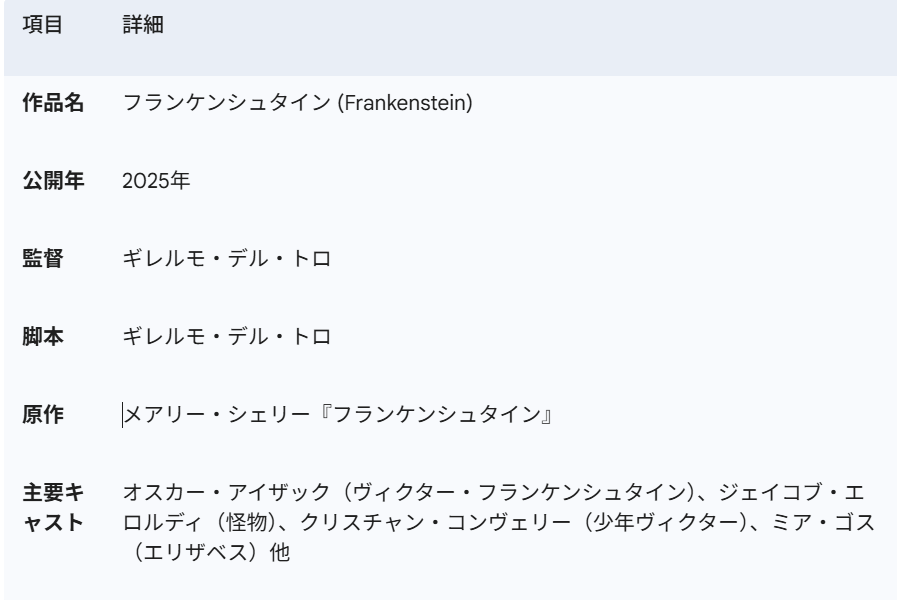 ギレルモ・デル・トロ監督の『フランケンシュタイン』は、古典ホラーの枠を超え、人間の内面に潜む闇と光を深く探求した、哲学的かつ芸術的な傑作です。