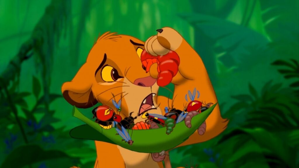 ディズニークラシックの名作ですが、主人公のシンバがティモンとプンバァに出会い、彼らのモットー「ハクナ・マタタ」の生活に染まる際、伝統的な肉食から一転して食生活を改めます。彼らが食するものが、緑色や黄色に輝く昆虫や幼虫です。