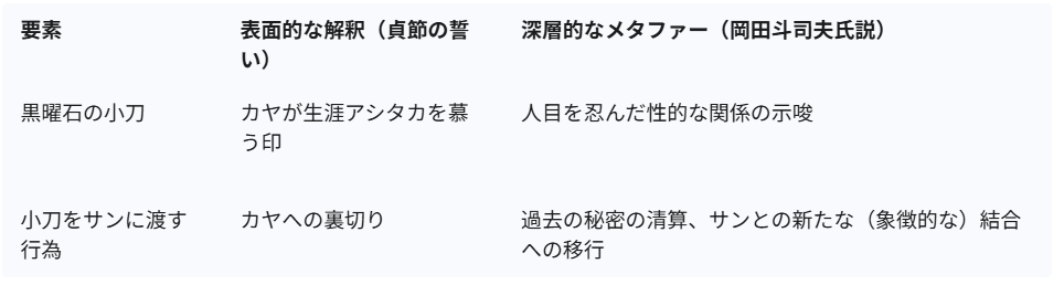 アシタカが旅立つ際、カヤが彼に黒曜石の小刀を渡すシーンは、「生涯、他に誰とも恋をしない」(貞操の誓い)という意味が込められています 。