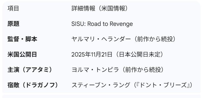 『SISU: Road to Revenge』は、前作のハチャメチャで容赦ないアクションと、歴史的な背景、そして復讐という熱いテーマが融合した、新たなカルトムービーの誕生となるはずです。